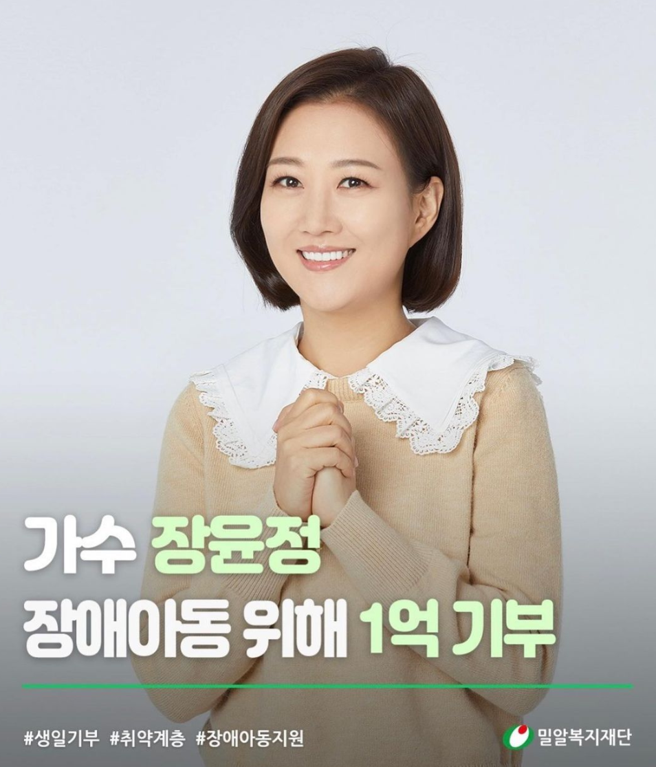 장윤정님이 기부한 곳은 밀알복지재단입니다. 밀알복지재단은 기독교 정신을 바탕으로 설립되어 장애인의 완전한 사회 통합을 목표로 지원하는 단체입니다. UN경제사회이사회로부터 특별 지위를 부여 받아서 전 세계 곳곳에서 활동을 펼치고 있