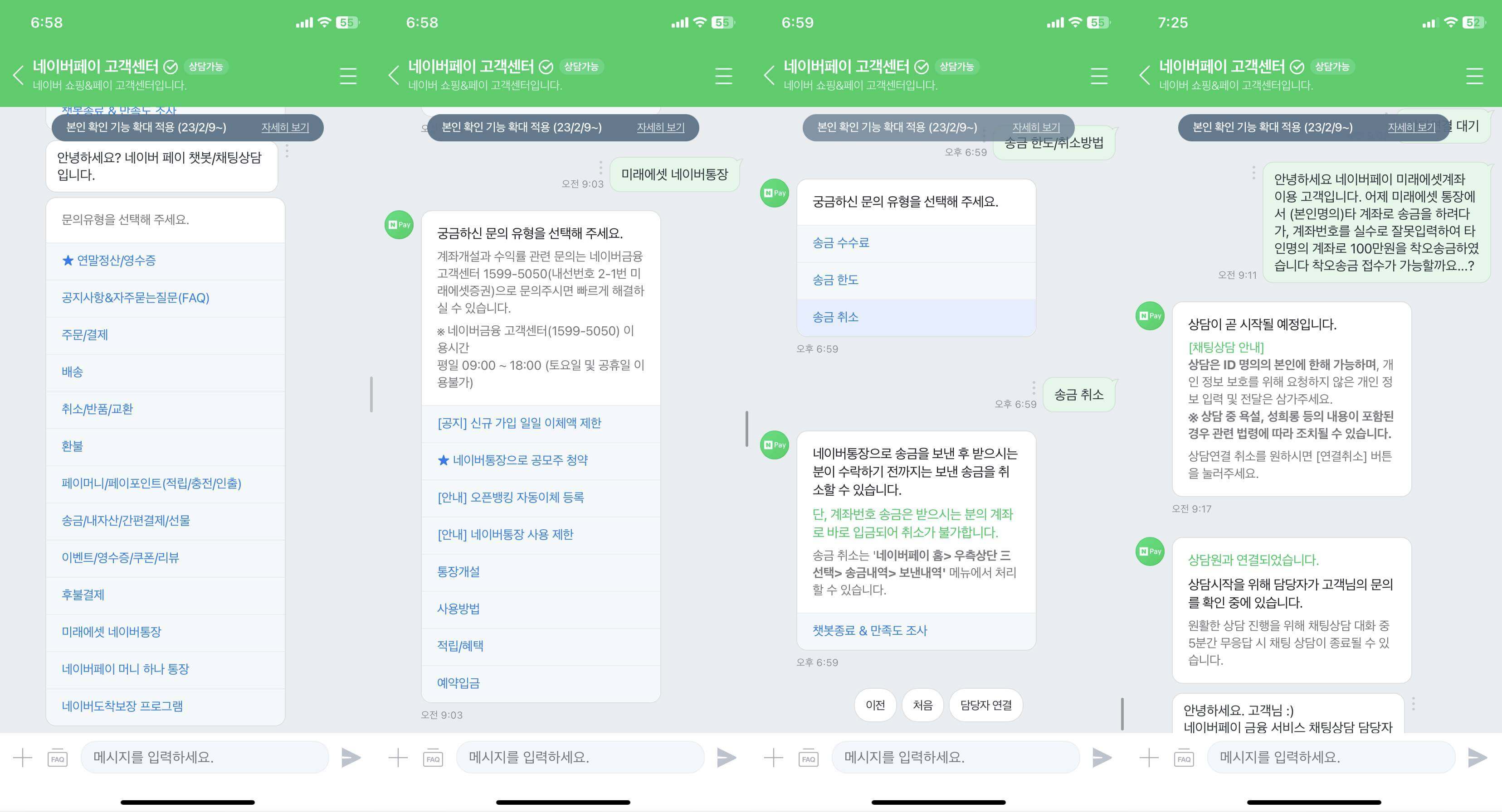 위의 사진처럼 고객센터 챗봇 > 미래에셋 네이버통장 > 사용방법 > 송금 한도/취소방법 > 송금 취소 > 담당자 연결 > 문의내역 남기기 순으로 진행하면 됩니다. 그러면 상담이 시작되고 여러가지 질문에 답변을 하면, 성공적으로 접수가 마무리됩니다.